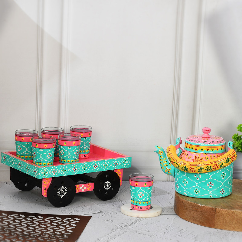 HandPainted Alluminium Tea Kettle with 6 Glasses and Wooden Tray For Home Decor , Tea Party , Serving