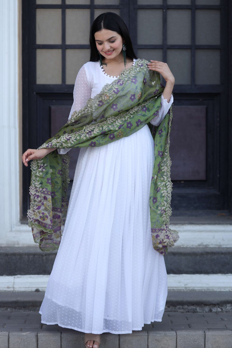 Step into timeless elegance with this stunning designer gown-dupatta set. The gown is made from premium georgette thousand butti fabric, designed with full sleeves, a round neck with potli finishing, and a graceful 3.5-meter flare for a flattering silhouette. Fully lined with soft cotton, it ensures all-day comfort while maintaining a luxurious appeal.