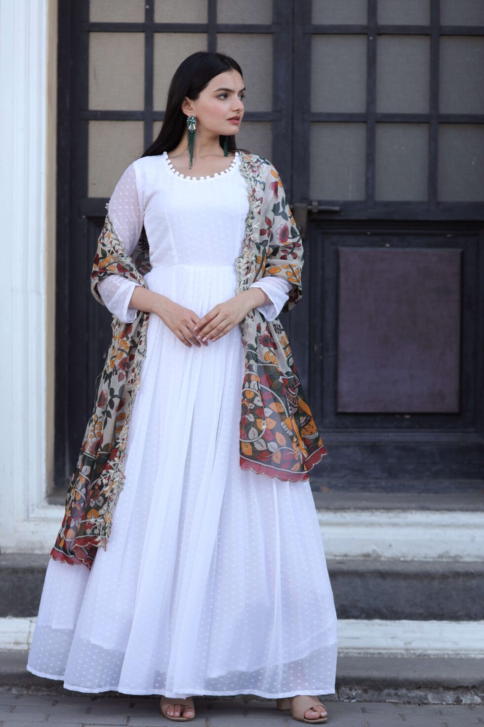 Elegant Off-White Georgette Gown with Organza Dupatta ? Designer Kalamkari & Leheriya Print Ensemble