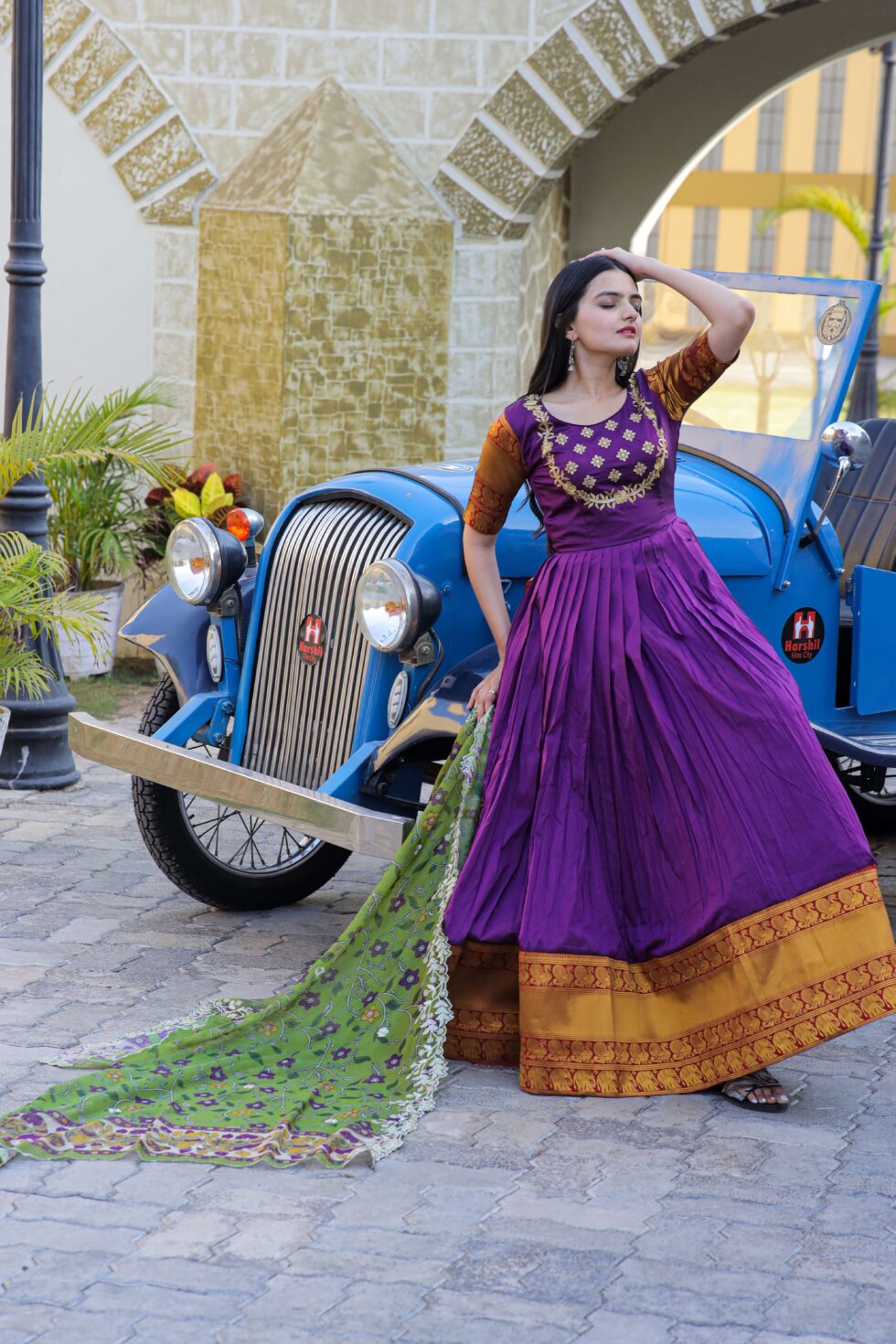 The ensemble is elevated with a stunning Tebby silk dupatta, enriched with Kalamkari-inspired prints and delicate embroidered cutwork, adding a regal charm to the outfit. Perfect for weddings, festive gatherings, cultural events, or special occasions, this gown-dupatta set promises a graceful and striking look.