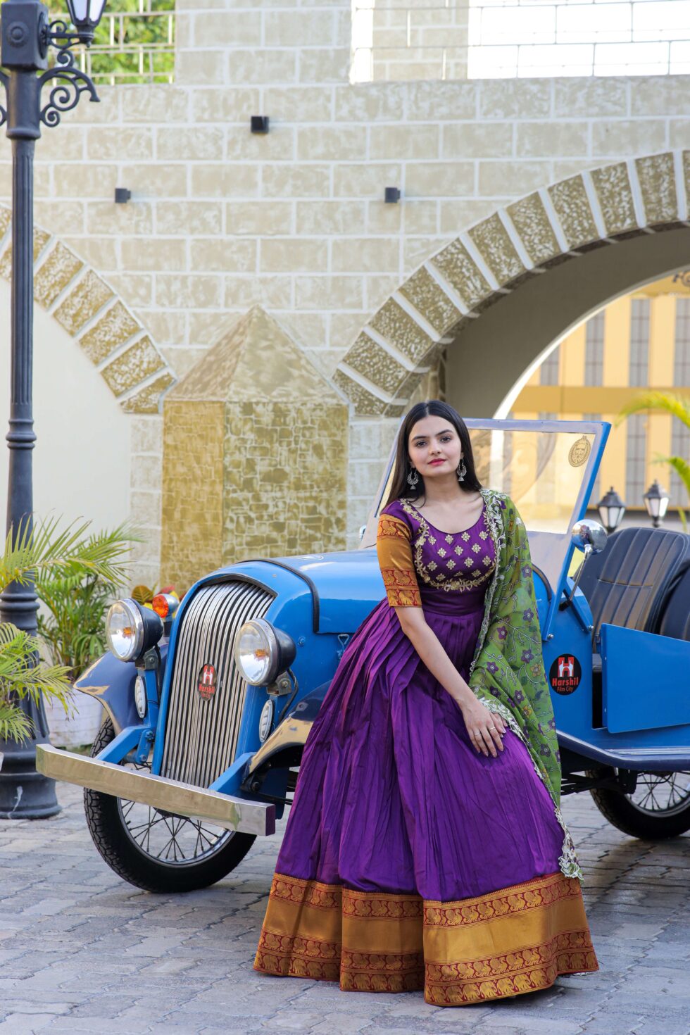 Experience timeless elegance with this designer silk gown, adorned with jequard weaving and delicate embroidery. Paired with a rich Tebby silk dupatta featuring Kalamkari print and embroidered cutwork, this ready-to-wear set is perfect for festive occasions, weddings, and celebrations.