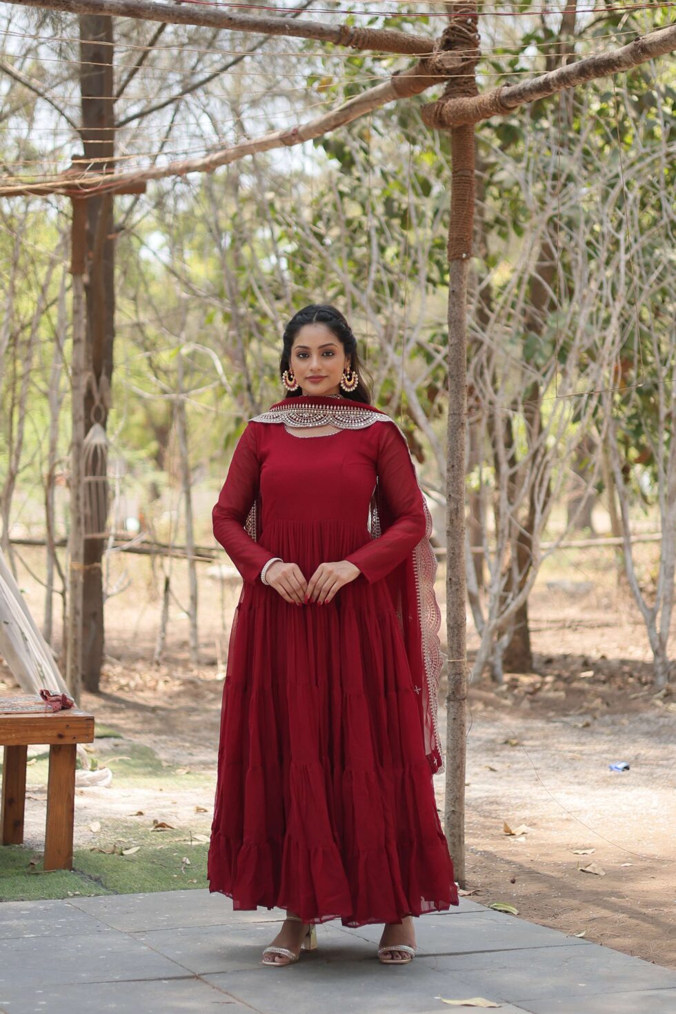 Maroon Premium Faux Georgette Designer Gown With Sequined Dupatta ? Fully Flaired Ready To Wear Set | Krishty Kala Studios