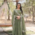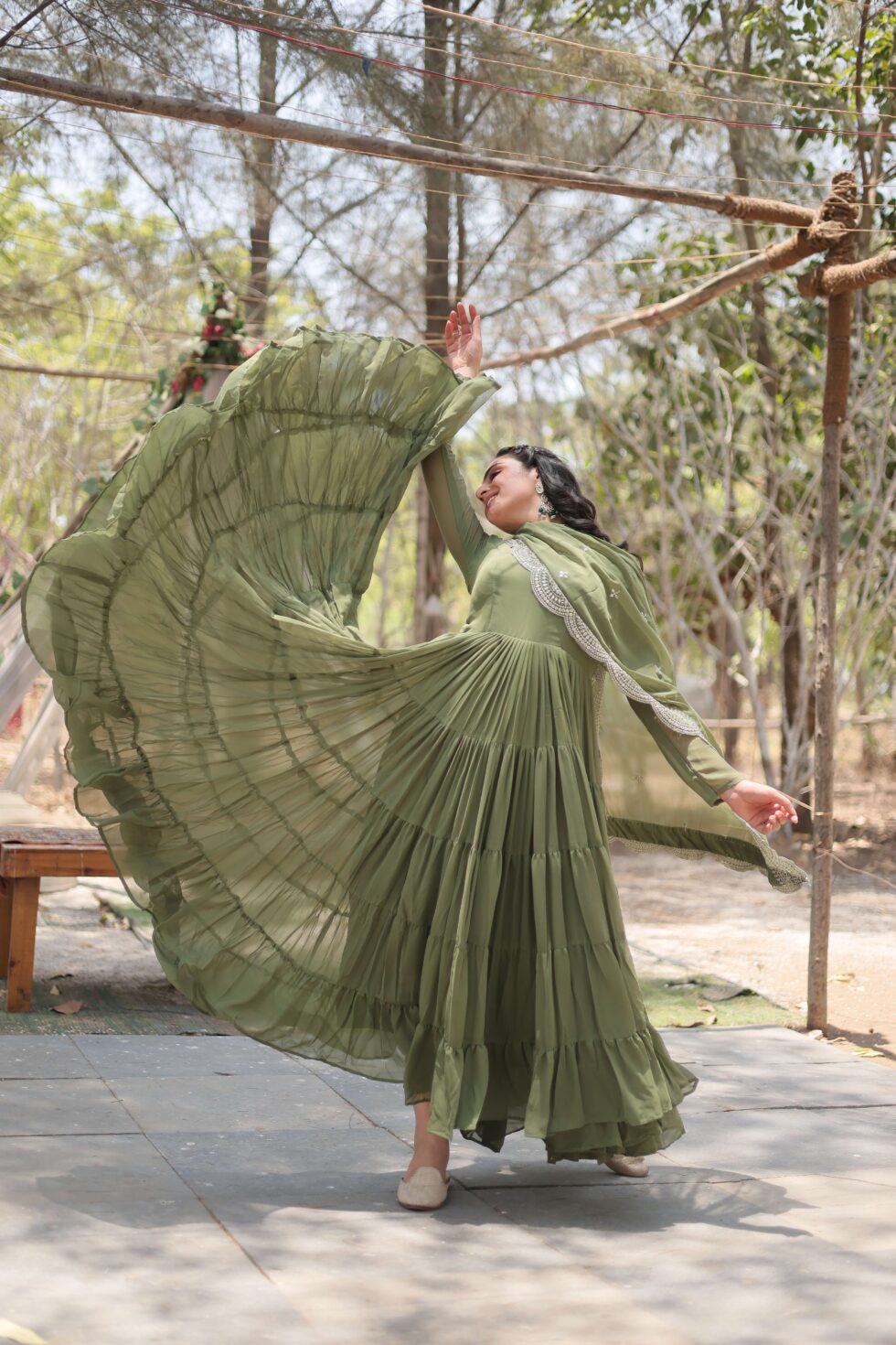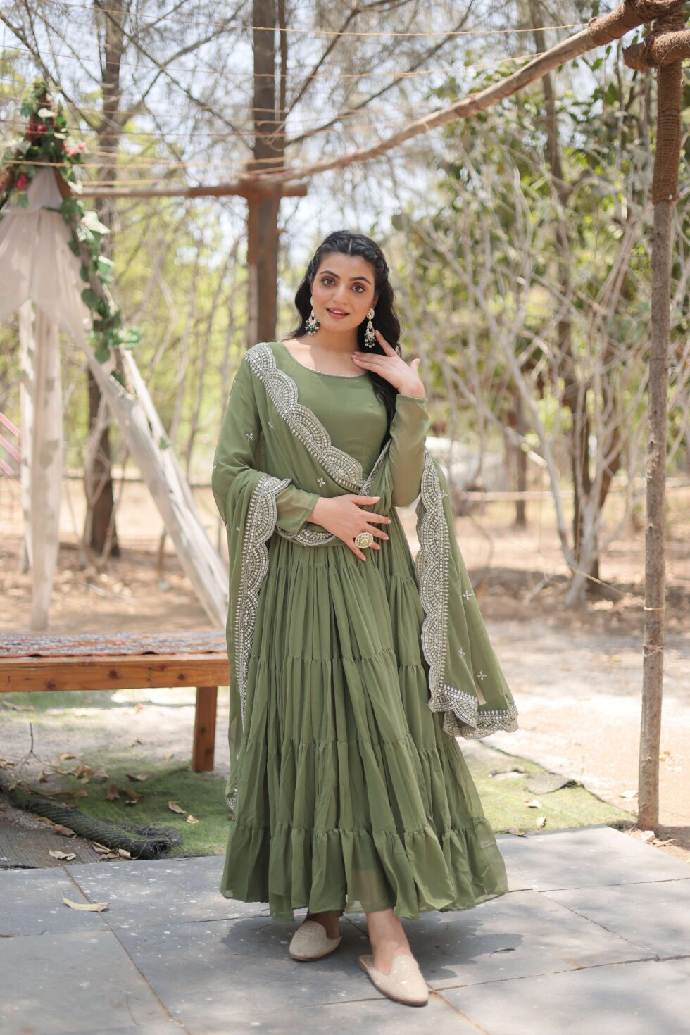 Mehandi Premium Faux Georgette Designer Gown With Sequined Dupatta ? Fully Flaired Ready To Wear Set | Krishty Kala Studios