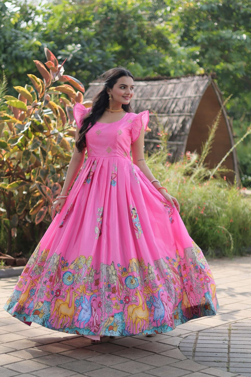 Pink Dola Silk Designer Gown ? Sleeveless Fancy Round Neck Printed Women?S Dress | Krishty Kala Studios